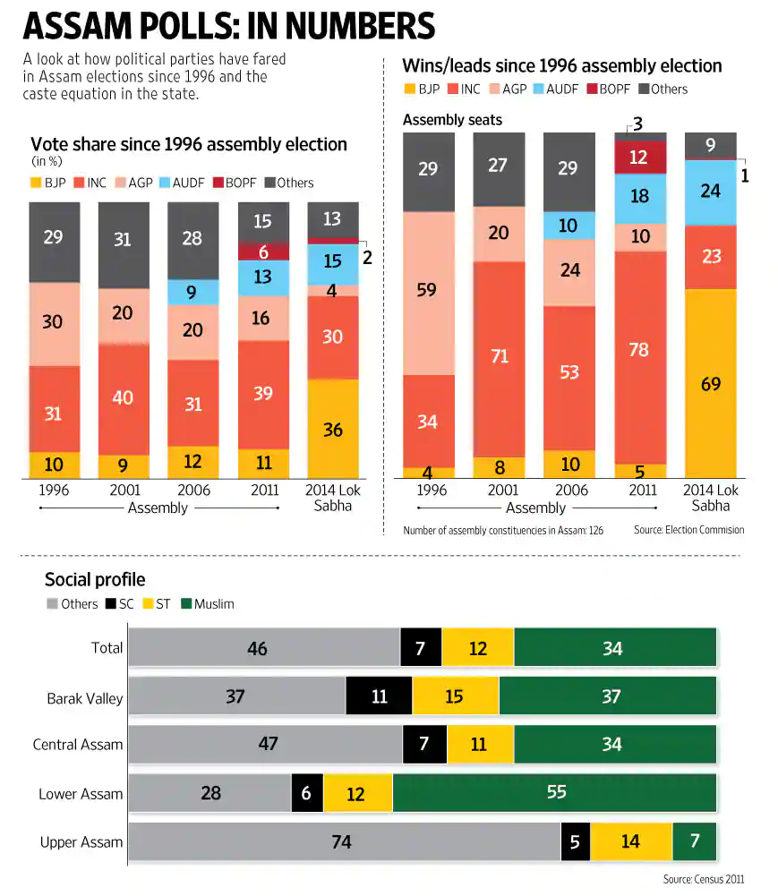 Historically, a party needs minimum 35% votes to get a simple majority in Assam. The BJP polled 36% votes in the 2014 Lok Sabha election, which may be difficult to match in an assembly poll.