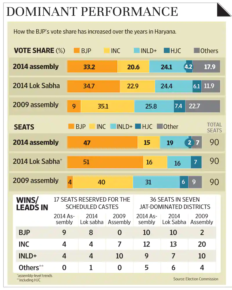 BJP has won all eight seats in the Yadav-dominated Gurgaon and Mahendragarh districts and three of six seats in Gujjar-